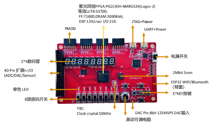 PGX-Nano是一套以紫光同创FPGA为核心的开发板,选用紫光同创logos2系列28nm工艺的FPGA(PG2L50H_6IMBG324)。板载USB转JTAG芯片,且开发板使用USB接口供电,连接Type-C JTAG接口即可实现供电和烧录比特流文件。