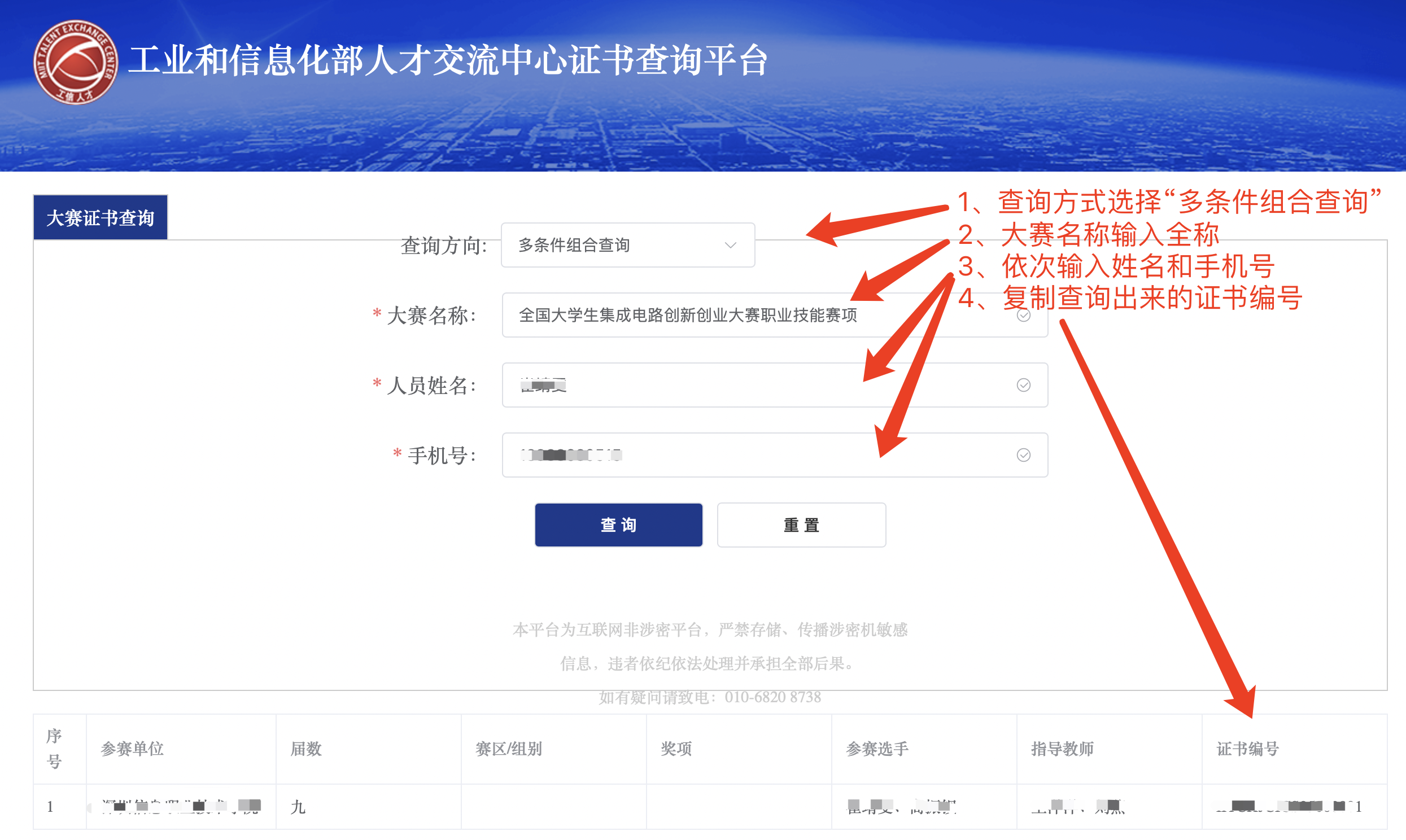 提醒:该姓名、手机号以报名时所填信息为准,如无法成功查询请先前往报名平台(赛氪)核对所填信息是否正确,信息正确无误仍无法查询请联系组委会老师查询证书编号。