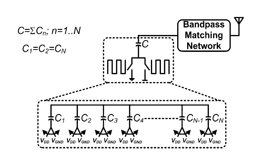控制电容的开关以射频频率切换时,此时开关电容视为工作状态;控制电容的开关常接地时,此时开关电容视为关闭状态。通过控制处于工作状态下开关电容的数量,可实现输出电压幅度的变化。