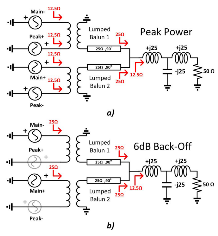 以SCPA的方式实现Doherty,提高PA饱和输出功率,同时提高PA在功率回退下的效率[3]。