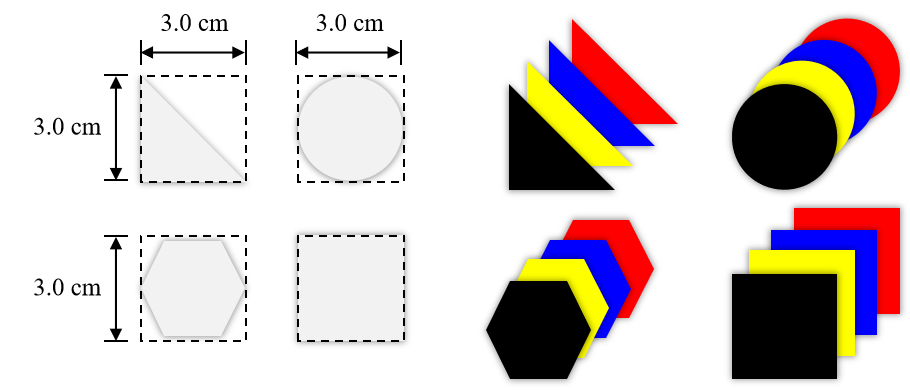 正方形物块表面图案共包含4种颜色 (红、黄、蓝、黑) 和4种形状 (正方形、圆形、正六边形、三角形),正方形物块尺寸为3*3 cm²,厚度为2mm,表面图案与正方形物块的物块的尺寸关系如下所示。