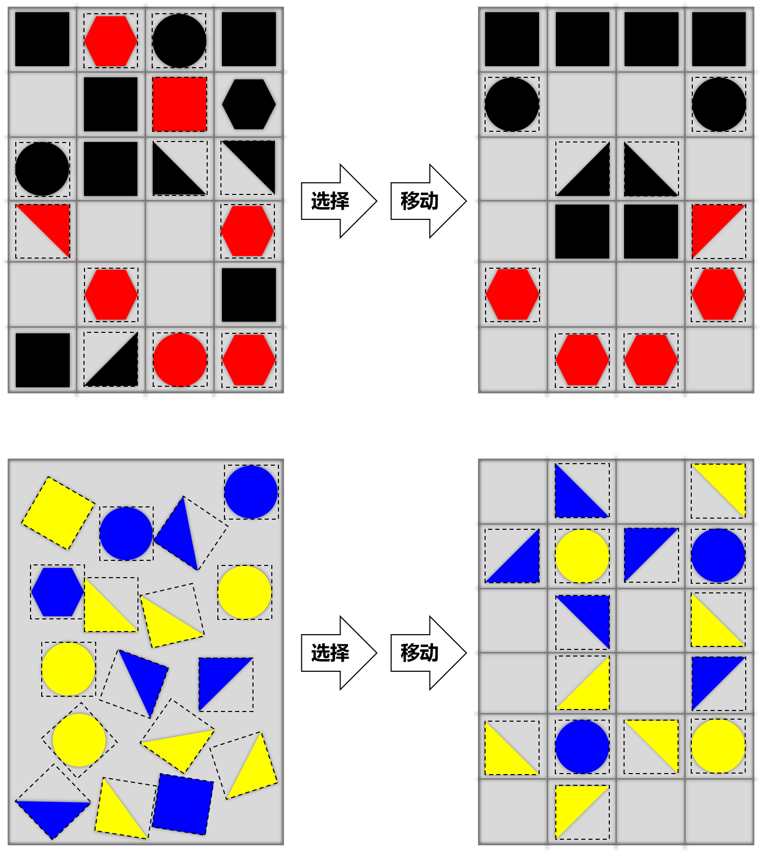 (1)难度1:不同形状和颜色的正方形物块,随机乱序规则放置在左侧仓库中(该难度下有辅助镂空网格);