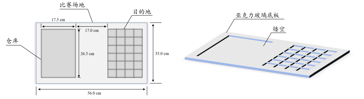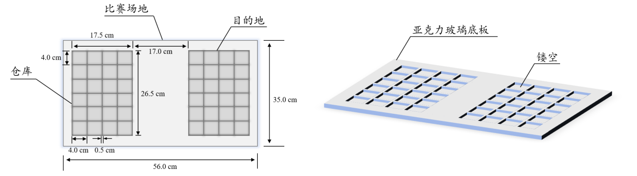 (3)注意:难度2不会出现等待移动的物体重叠的情况,但是可能有边缘粘连。另外,比赛场地可如上图所示为亚克力玻璃底板,也可为钣金或者其他形式的材料,请参赛团队自行考量固定装置的形式和规格。