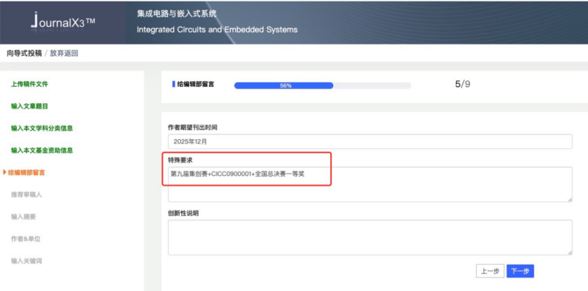 4. 集创赛参赛选手需在投稿流程【给编辑部留言】-【特殊要求】栏下备注“第九届集创赛+报名编号(CICC开头+7位数字的编号)+所获奖项”。