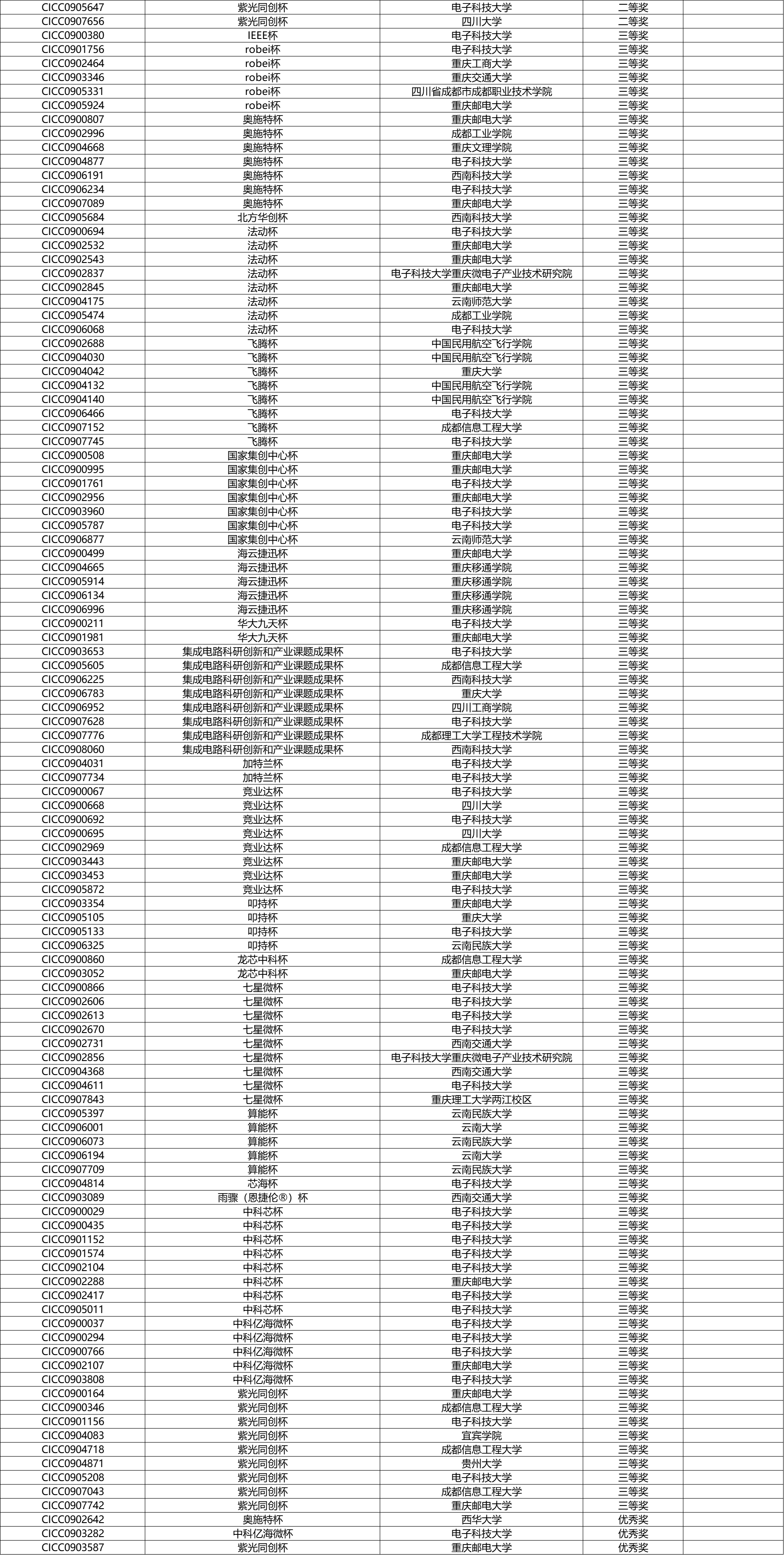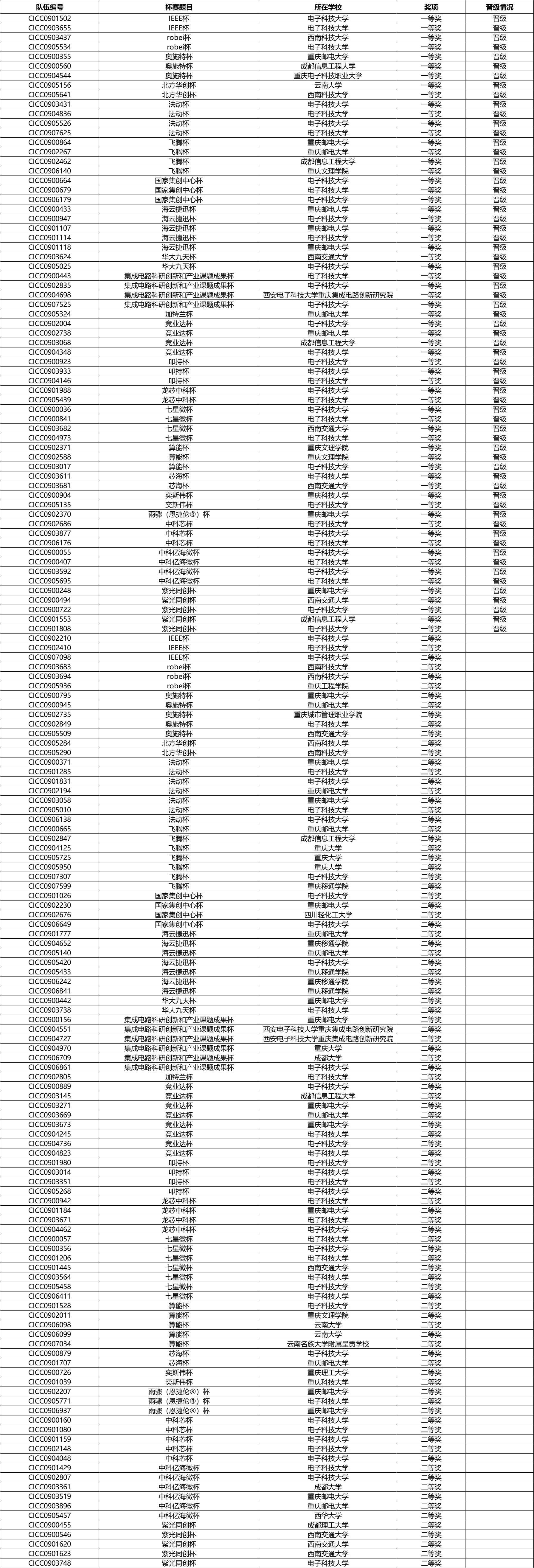 为便于查找,本表参考以下顺序进行排序:奖项、杯赛、编号、学校,与团队成绩无关。