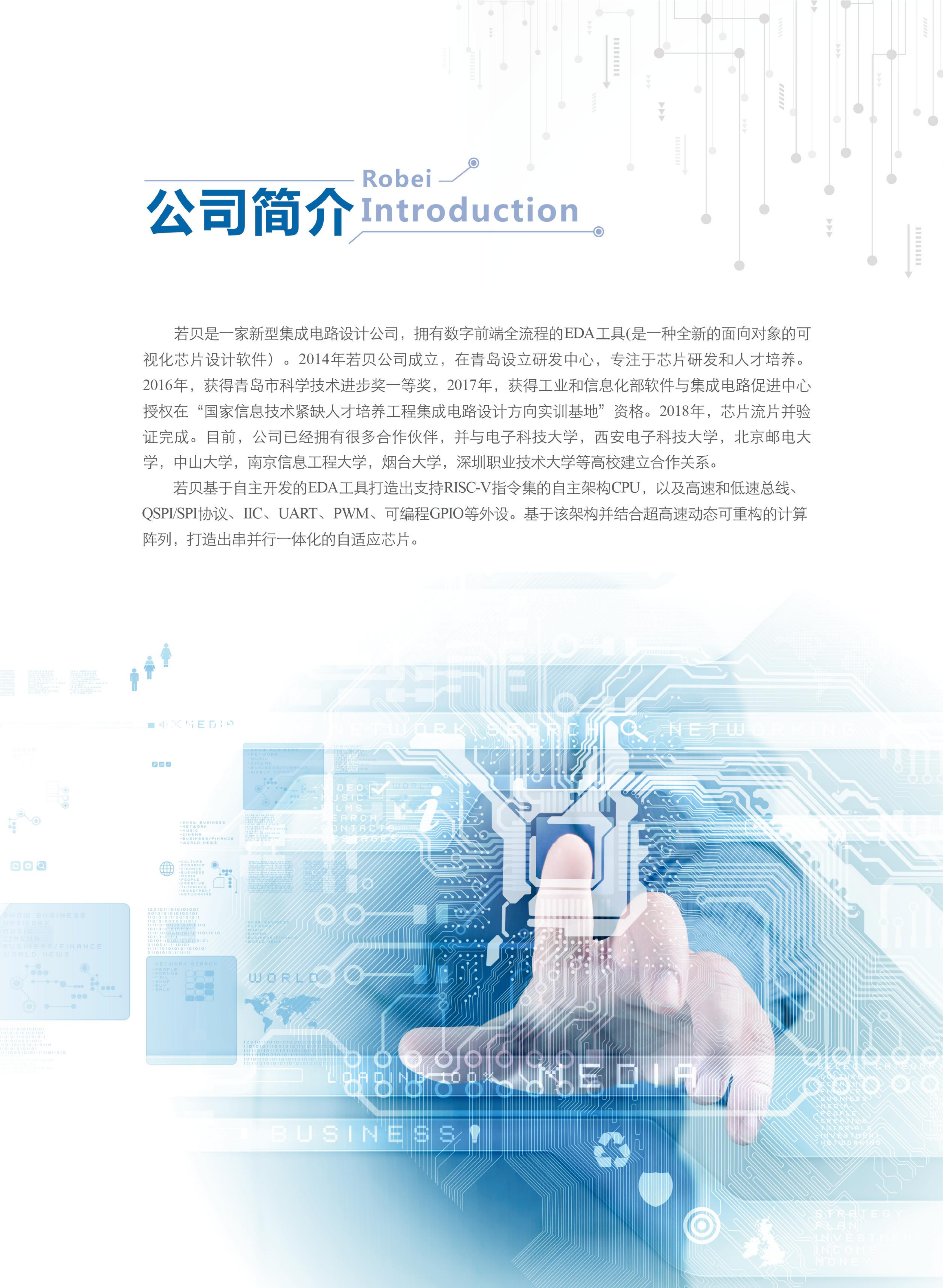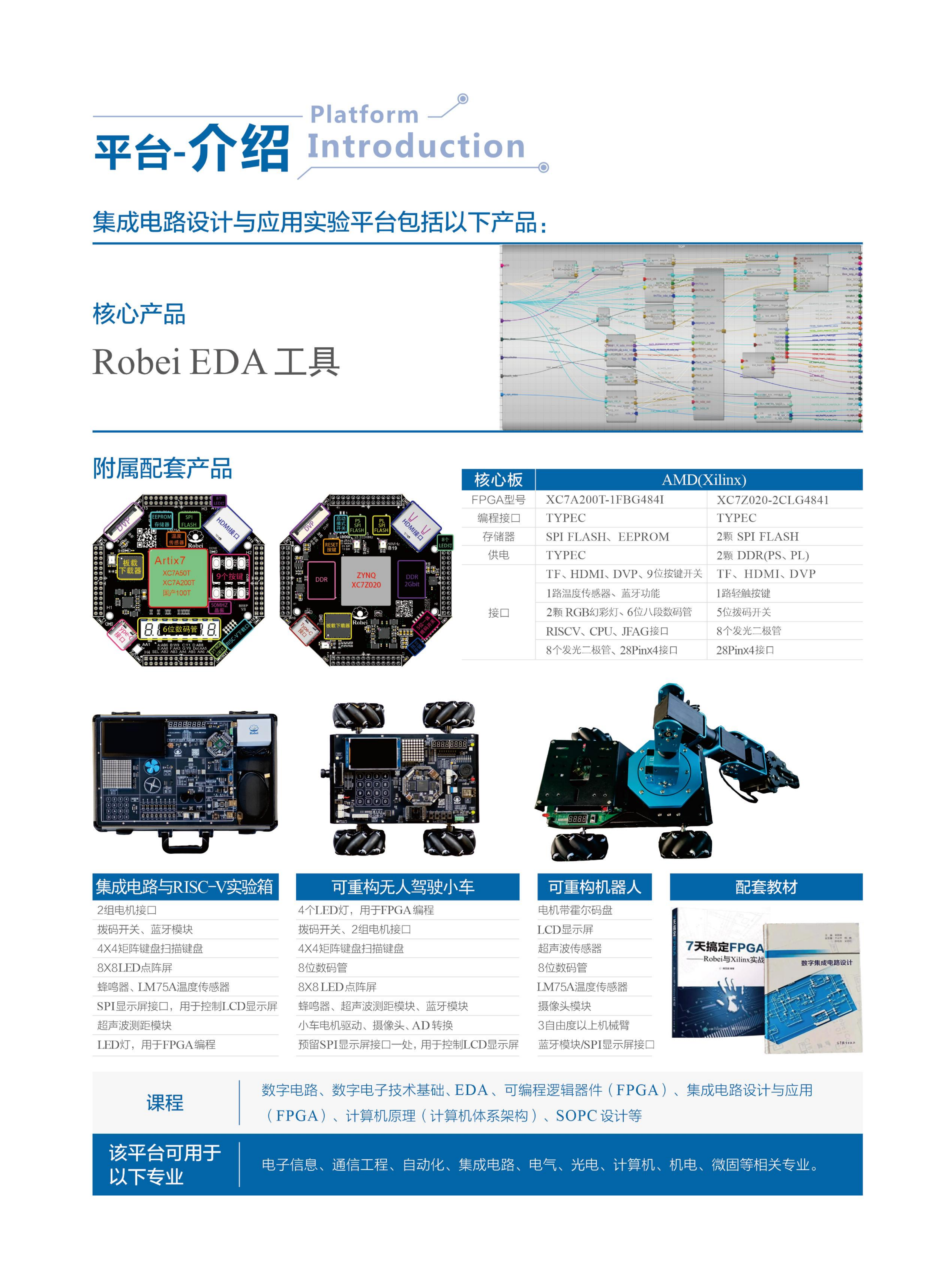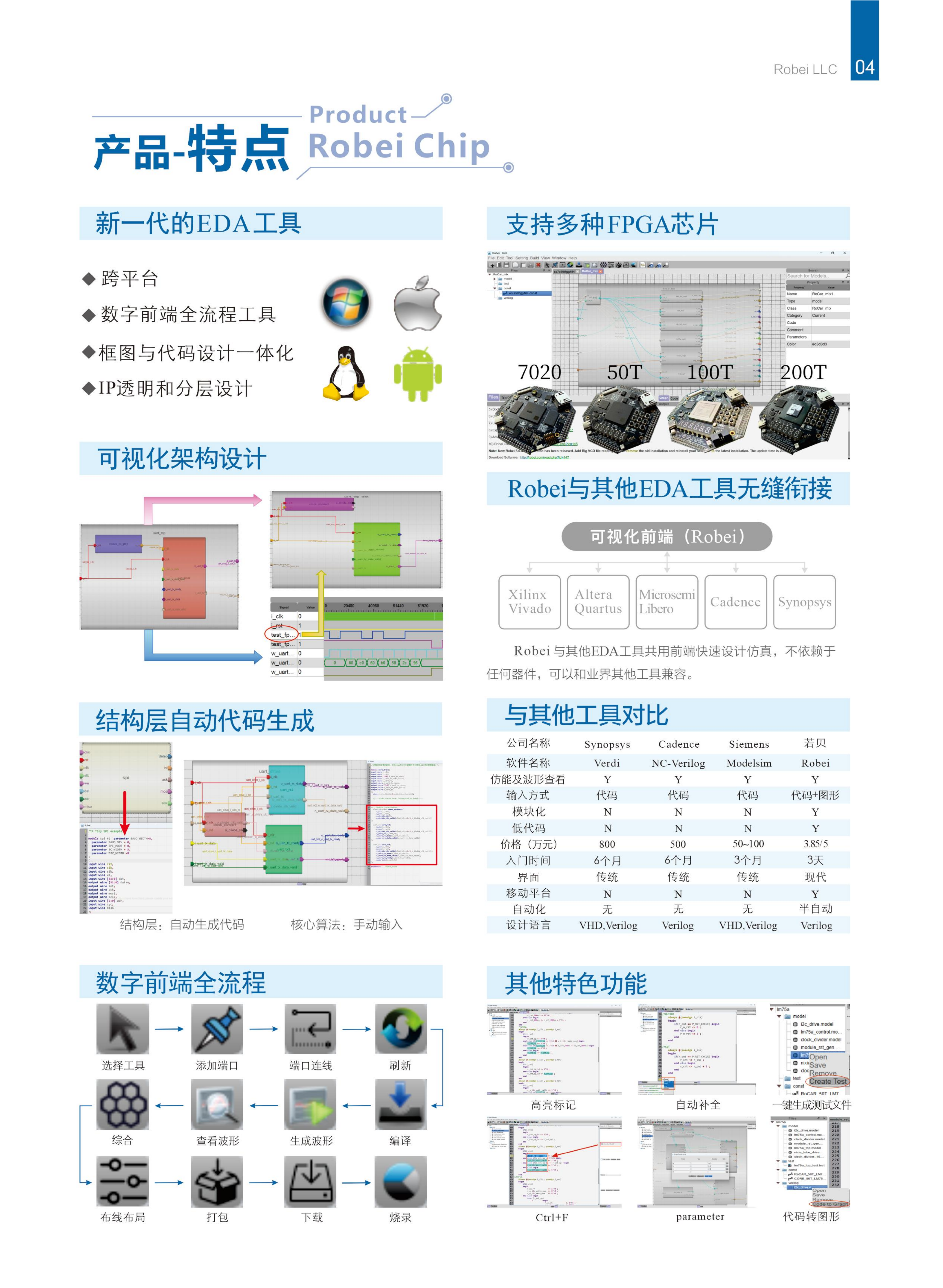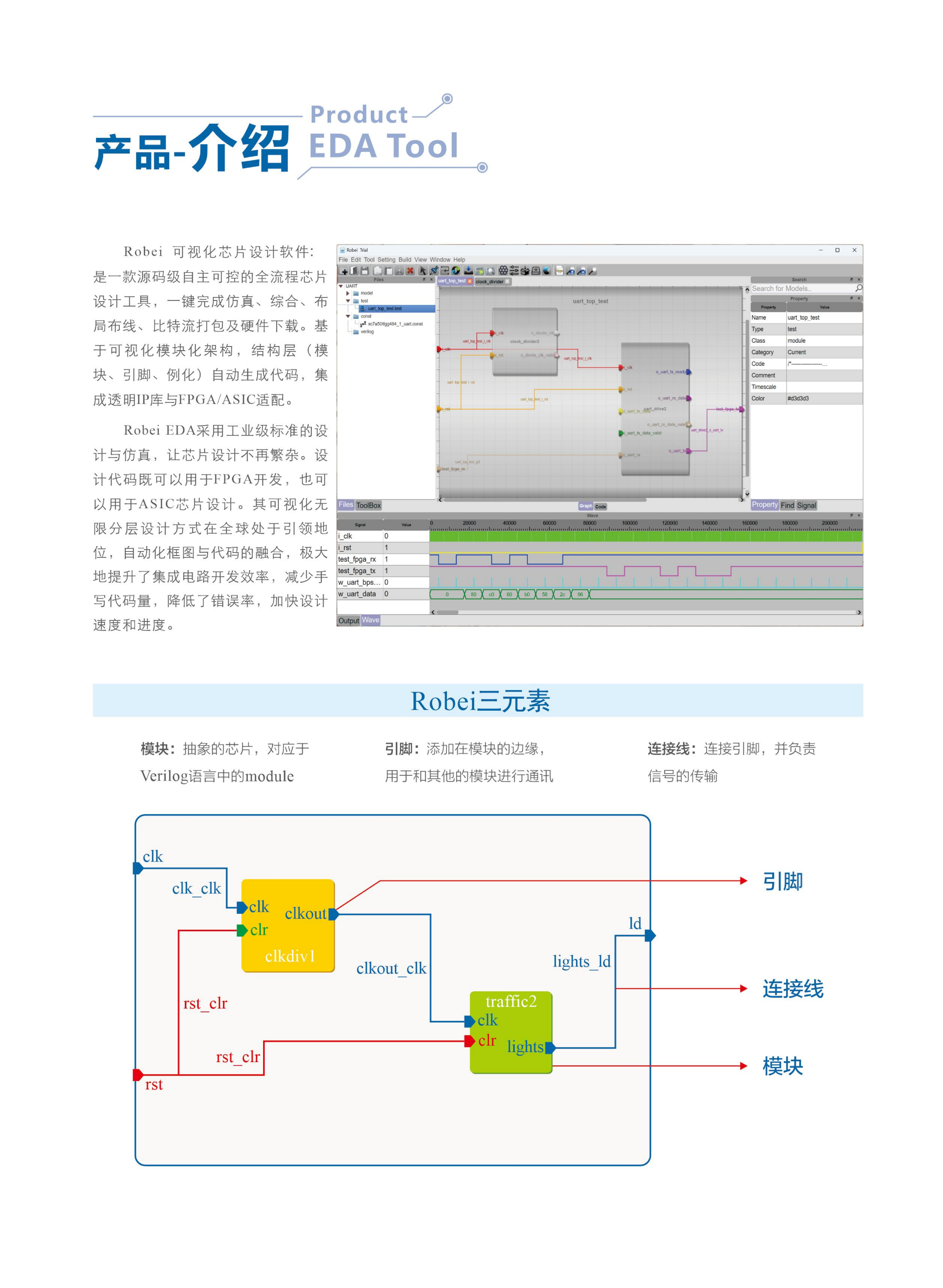 若贝(Robei)公司成立于2014年,拥有自主Robei EDA工具、RISC-V SOC 的数字IP库,自适应芯片等集成电路设计平台。 Robei EDA工具减少30%~60%代码撰写量,提升工作效率,将芯片设计入门门槛降低到中小学。Robei EDA工具覆盖数字前端设计的全流程, 融合图形化设计、代码撰写、语法检查、仿真、波形查看、综合、布局布线、比特流生成、下载到FPGA以及烧录等功能。 采用无限分层的设计理念将复杂平铺的集成电路变成可重用、易复用的框图IP设计方式。目前Robei EDA工具已经在全球50多个国家进行使用。Robei EDA作为新一代EDA设计工具,具备可视化、易用、易重用的特点。Robei既可以支持AMD的FPGA开发,也可以支持国产FPGA的开发。 Robei EDA工具具备可视化架构设计、算法编程、结构层自动代码生成、语法检查、编译仿真、波形查看、综合、布局布线、生成比特流、下载和烧录等功能, 应用于FPGA设计全流程和ASIC数字前端验证。可视化分层设计架构可以让工程师一边搭建一边编程,具备例化直观,无需记忆引脚名称,减少错误,节约手写代码量等优势。Robei EDA工具将芯片设计变得简单直观,同时配备高等教育出版社出版的《数字集成电路设计》教材与实验指导书以及大量的案例与视频教程,可以极大地降低学习芯片设计的入门门槛,加速设计过程。若贝已经和国内超过300所院校合作,合作客户超过2300位教师。同时,若贝在很多企业的工程师也在使用。公司具备集成电路设计软硬件体系,采用AI加速芯片设计,同时配合AI打造集成电路相关的全系列应用开发平台。